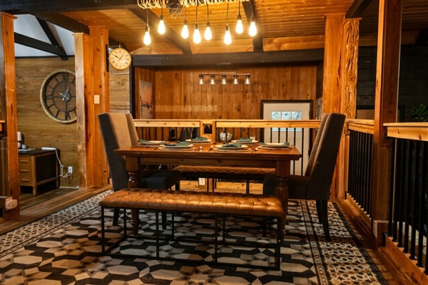 Share meals and memories at your warm wood dining table, with plush seating, leather benches, and a view of the rustic stone fireplace just steps away from the loft staircase.
