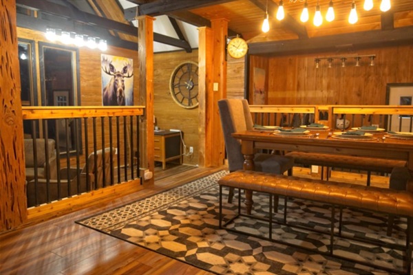 Gather around your rustic dining table under warm Edison bulbs—perfect for cozy meals, board games, or late-night chats in your private mountain-style retreat.